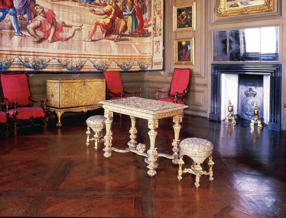 Boughton House With His Grace Richard Scott Peter Rieusset's Parquet Floor in a Boughton State Room The use of the ‘Parquet de Versailles’ flooring in many of the State rooms at Boughton house was quite new to England. In addition to supplying and laying the parquet floors, Peter Rieusset supplied countless other joinery items from garden rakes, chests, desks to a billiard table. His huge 300 year old billiard table at Boughton House has been restored to full working order.