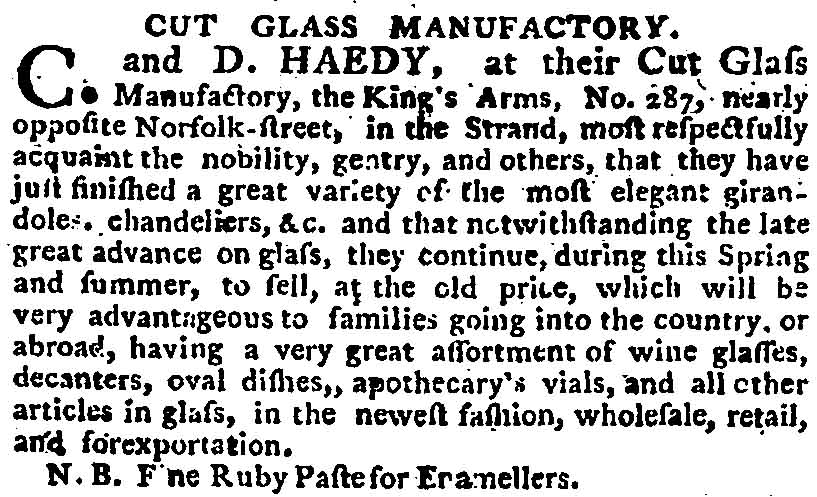 A Peter Rieusset Junior married Maria Teresia Haedy in London in 1782. Maria was the daughter of Christopher and Anna Maria Haedy. Christopher ran a Glass manufacturing business at 287 the Strand (now the site of Australia House) and was quoted as claiming "He was the German who was the first that brought the art of cutting and engraving glass from Germany". He was born in the small mountainous village of Stein Schenow, Bremmich, Kannich in Bavaria and came to London where he received his 'Letter of Denization' on 6th July 1793 after swearing allegience to King George III as a foreign-born subject.