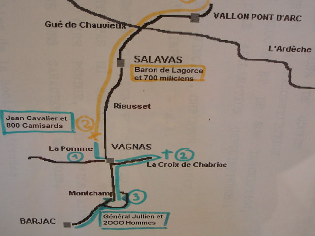 Between Vagnas and Salavas is an old Rieusset house built beside the Roman Road. At dawn one January morning in 1703 Jean Cavalier with 800 Protestant Camisards fought a pitched battle with 700 Catholic Regional Militia under the Baron de Lagorce at the Rieusset location. The Camisards won the day, but soon after were wiped out by a 2000 strong Catholic army brought by General Jullien from nearby Barjac.